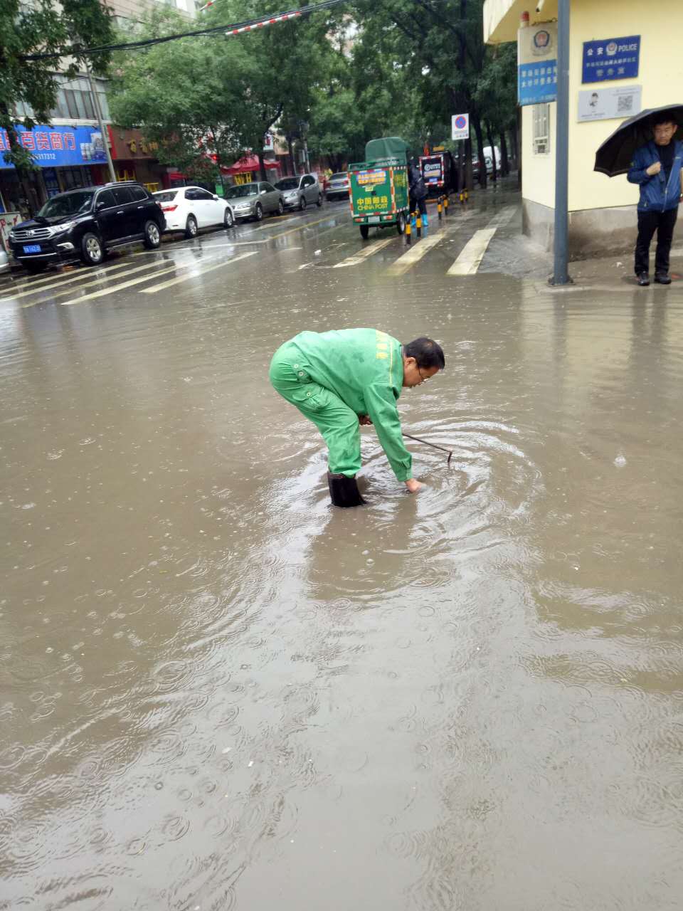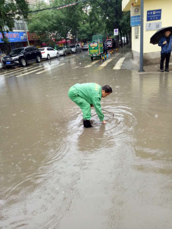 暴雨来袭,城关物业每位员工都坚守在抗击暴雨的第一线。保安们在风雨中麻利的扛起一袋袋防汛沙袋垒在车库、地下室等低洼地区的入口,以防雨水倒灌。保洁员们用清洁工具不停地将室内积水往外排,为了保证顺利排水,在暴雨中查看下水道口,不顾水浸湿裤管和衣袖,直接将手伸进下水道口,把灌入的杂物清出。为了更迅速的排水,他们没有打伞,两手握着棍子奋力的疏通下水道。技术维修部的同事们时刻查看设备是否进水,是否正常运行。虽然是在室内,可是他们也已经浑身大汗,即使是这样,也一刻不放松。据第一事业部王总介绍,此次暴雨虽说突然,但是对于各项目来说却一点也不突然,因为自4月份开始,各项目部就已经成立了应急小组,储备了防汛物资,如沙袋、手电等,再加上日常的演练,每个人都已经对自己的工作轻车熟路了,在这这样的前提下安排工作省时又高效。因此,此次的防洪抗暴工作才能在最短的时间内达到最好的效果。